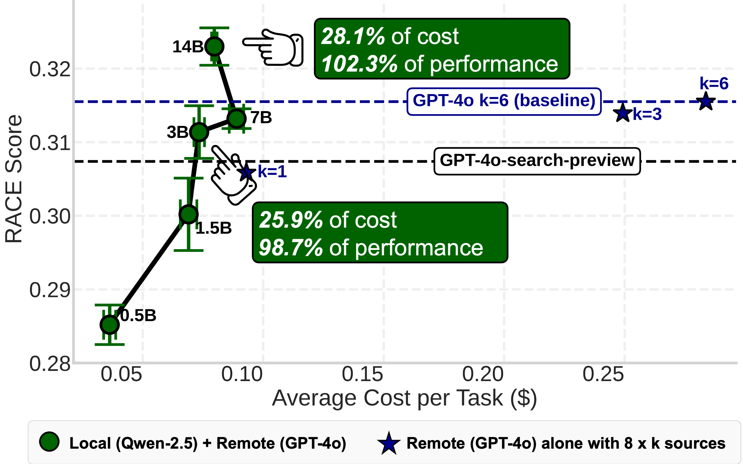 We put these lessons to the test in something that looks closer to a Deep Research system. On DeepResearch Bench, we scaled compute into larger compressors instead of scaling predictors. With compressors that could run locally, we were able to achieve 102% of frontier-LM only performance at only 28% of the cost.