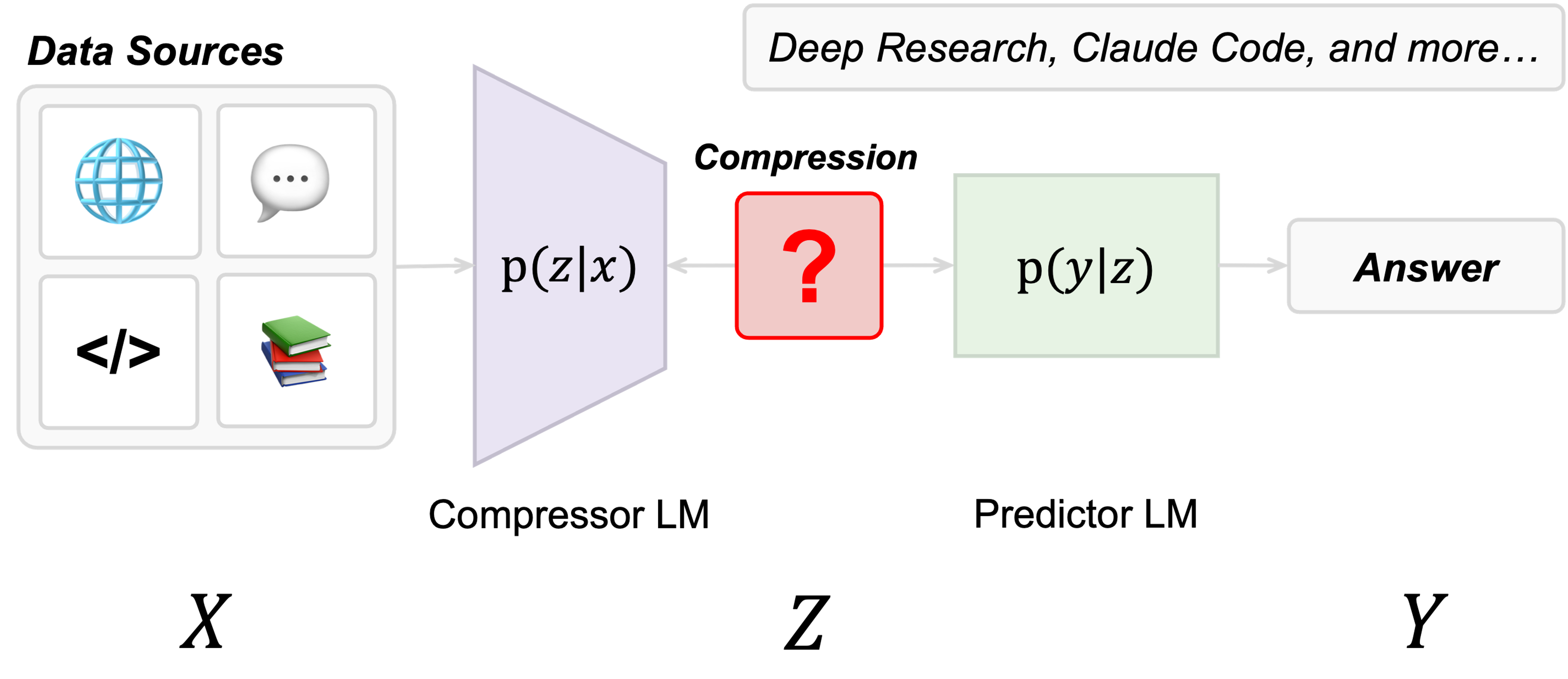 TL;DR Many contemporary agentic systems exhibit a clear pattern: larger models interact with the user and orchestrate smaller models that directly interface with the data. In “Deep Research” systems (Google, Anthropic), smaller worker models analyze targeted search results and provide summaries to a larger orchestrator model, which synthesizes a final research report. This separation of control and data plane is also evident in Claude Code and relatives (OpenCode), but it is unclear where scaling actually pays off. This compression-prediction structure isn’t new, an information-theoretic model helps us derive design principles that guide compute spending. Looking at the information actually communicated between the models showed that investing in compressors for relatively cheap mitigates the need for expensive frontier predictors.