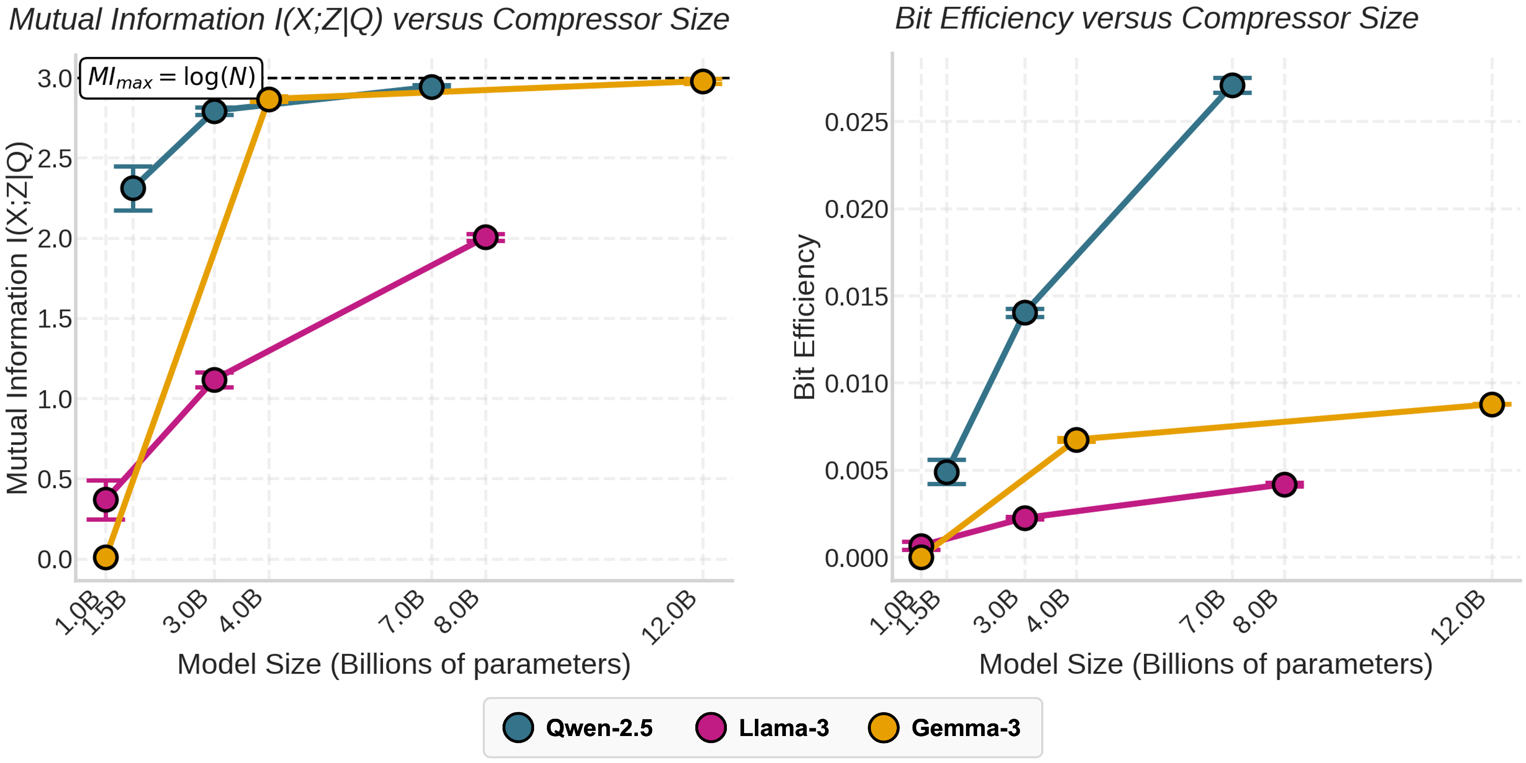 More importantly, larger models produce compressions that retain more mutual information—up to 5.4x more! Since larger compressors are also more concise, they don’t only communicate more information, but do it more efficiently per token.