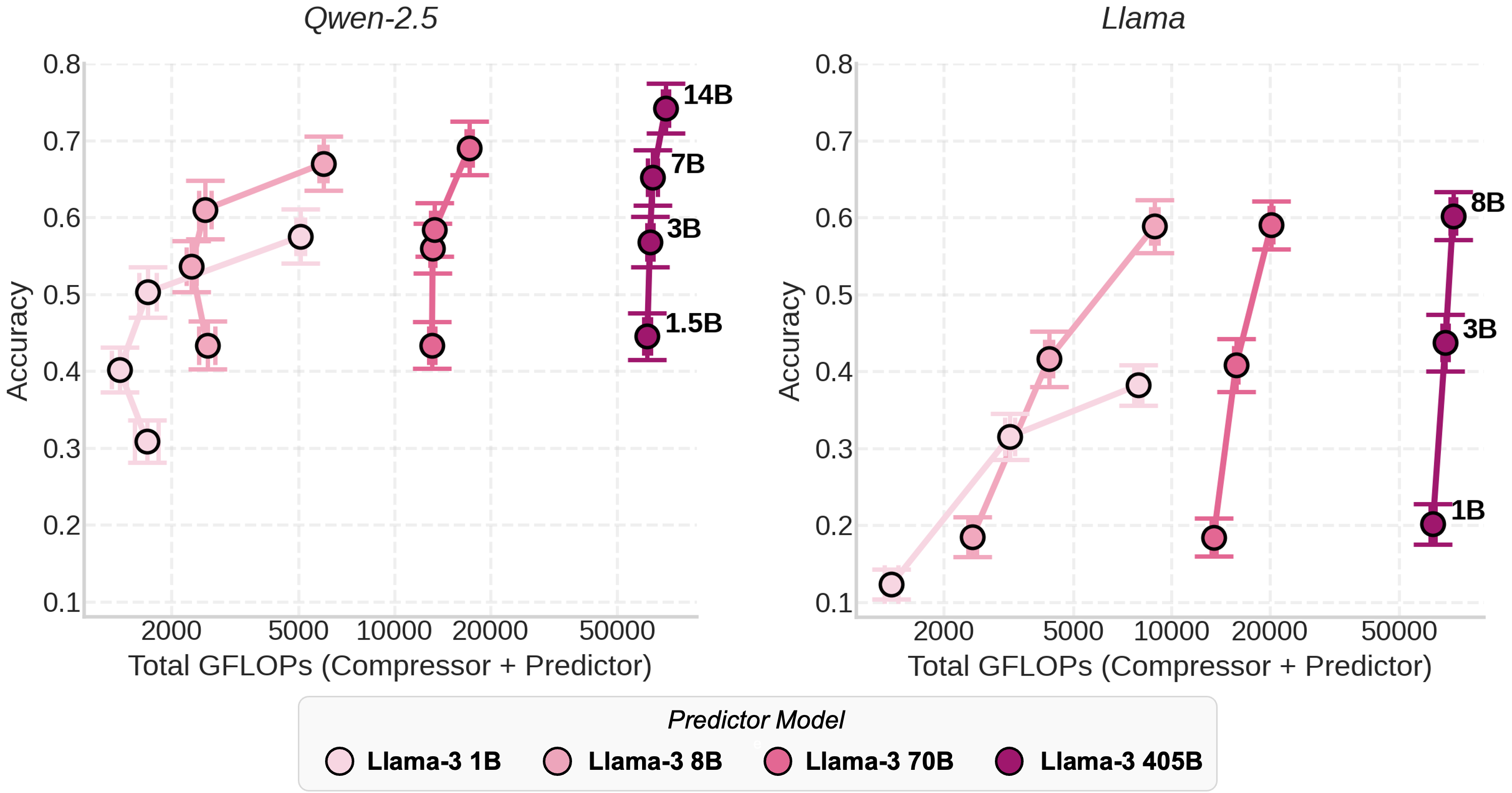 Scaling predictors. Now flip it: we fix the compressor, scale the predictor from 1B up to 405B. The accuracy curve flattens out quickly once a baseline predictor capacity is reached (8B–70B). While scaling a Qwen-2.5 compressor from 1B to 7B improves accuracy by 60%, scaling the predictor from 70B to 405B adds only 12%. No matter how big the predictor is, it cannot recover information that was never provided by the compressor.